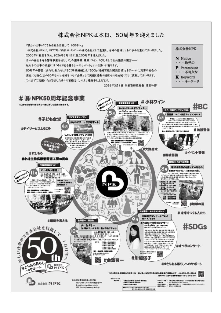宮崎日日新聞に広告掲載 2026年3月1日 お知らせ 本日付の宮崎日日新聞に、株式会社NPK 創立50周年記念広告を掲載しております。50周年記念事業の内容がわかる内容となっております。ぜひご覧ください。