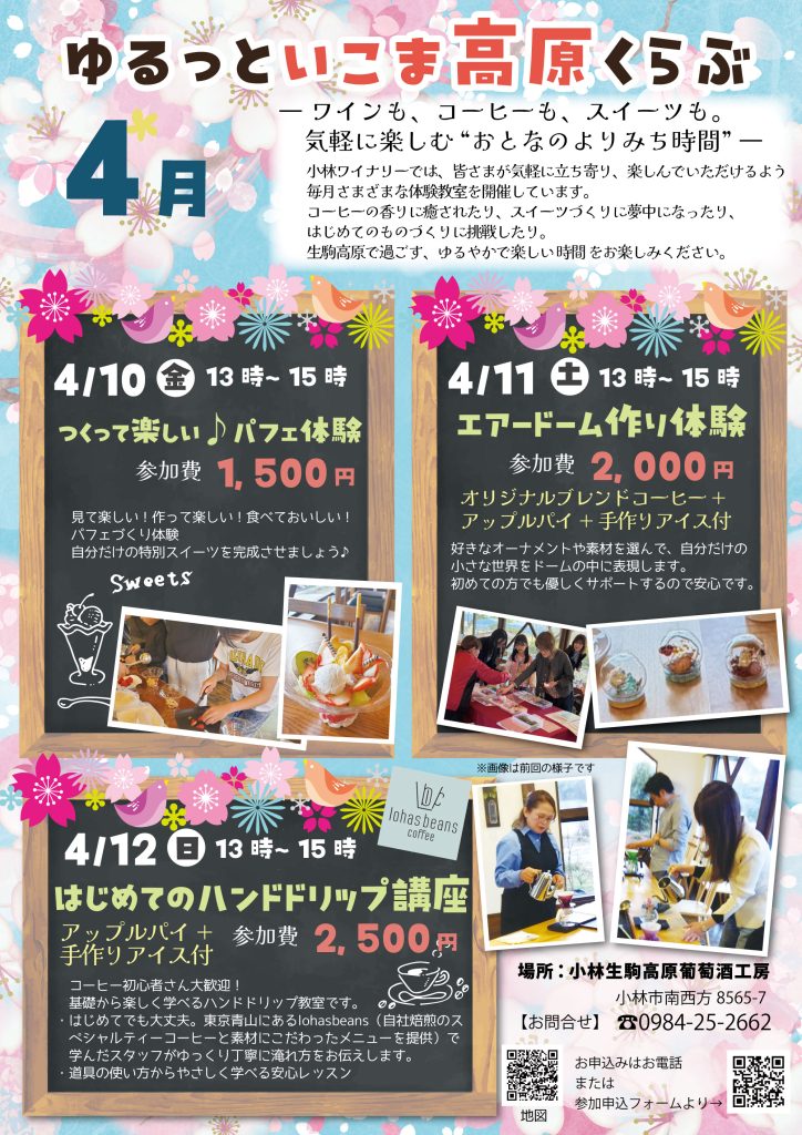 ワインのある高原の時間を楽しみながら、コーヒーやスイーツ、ものづくりを体験できる